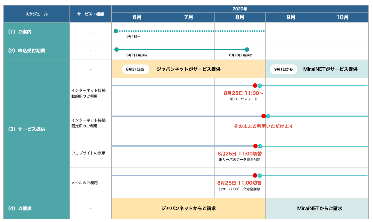 この度、株式会社インフォウェアが提供するジャパンネットのプロバイダサービス(インターネット接続、及び付随するHP・メールサービスの一部)を、弊社株式会社ミライコミュニケーションネットワークに移管することになりました。移管するサービス及び移管の流れにつきましてご案内いたします。移管に伴い、ジャパンネットサービスをご利用のお客様には、移行申請、各種設定の変更、ウェブサイトの移行作業等をお願いいたします。